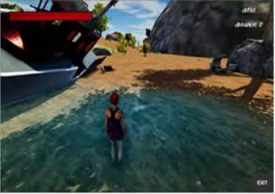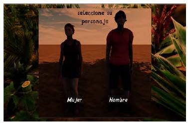 El menú principal cuenta con los botones scores y galería en la esquina superior derecha; en la esquina inferior derecha se cuenta con el botón para ir al menú selección personajes (Fig. 5). En caso de que no se elija un personaje, el botón de play en el centro, igualmente enviará al menú selección personajes. Una vez se seleccione un personaje, aparecerá un botón en el centro con este dibujo (✓). Al ser accionado, este botón confirmará la selección del personaje y abrirá la ventana del juego (Fig. 6); el personaje elegido inicia estando inconsciente en la playa, pero en unos segundos se levanta y comienza a correr.