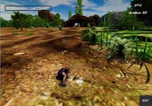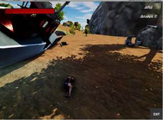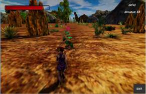En la ventana de juego se tiene la distancia recorrida por el jugador y su nombre de usuario en la esquina superior derecha; mientras que en la izquierda está la barra de vida del personaje y un botón provisional para cerrar el juego en la esquina inferior derecha (Fig. 7).