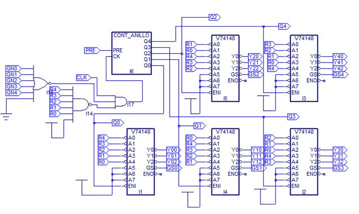 El diseño se probó sobre la tarjeta de desarrollo Breakout de Lattice, que usa el CPLD ispMACH4256ZE. Emplea un contador de anillo y cinco decoders 74138, también de la biblioteca Vantis (véase Fig. 3 y Fig. 4).