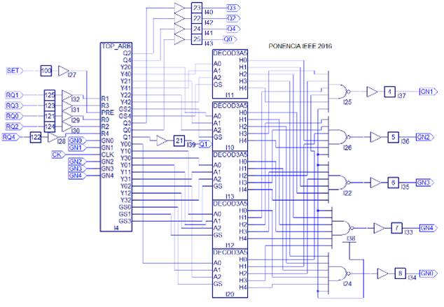 Se usó el software profesional ispLEVER classic para crear un árbitro con prioridad rotatoria usando la biblioteca Vantis y el estilo jerárquico. La Fig. 2 exhibe el símbolo más importante [6], [7].