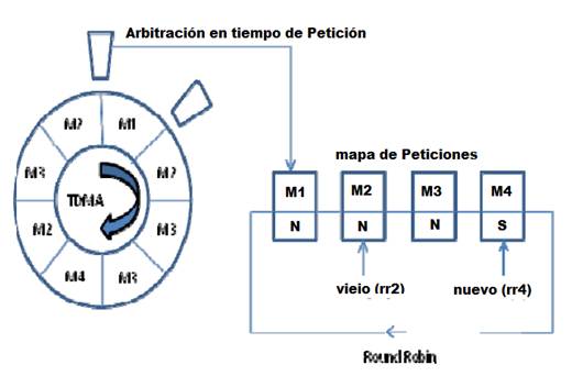 En el esquema de división multiplexada de tiempo (TDM), el tiempo de ejecución es dividido en ranuras de tiempo (mini-ranuras) y coloca cada ranura para la petición del maestro, Ello es un algoritmo de arbitración de dos niveles [8]. En primer nivel, se tiene una rueda de tiempo, donde las ranuras han sido reservadas para cada maestro particular, múltiples ranuras serían necesarias para realizar todas las transferencias, si hay algún maestro solicitando en el momento actual y tiene pendiente una petición para acceder el bus, el árbitro concesiona el acceso al que pide el bus y la rueda se moverá a otra ranura próxima, esto es muy simple y fácil de implementar pero su desventaja asociada con ella, la pobre latencia y el tiempo perdido en las ranuras. Para superar tal desventaja, el segundo nivel de arbitración permite que el bus para otro maestro solicitando. Por ejemplo, si la presente ranura está reservada para M1 para comunicarse y sus datos no están el segundo nivel de arbitración cuenta con un puntero round-robin rr2 que incrementa el puntero desde su posición actual M2 hacia otra petición próxima M4, según se muestra en la Fig. 5. Otro árbitro similar se presenta en el siguiente listado.