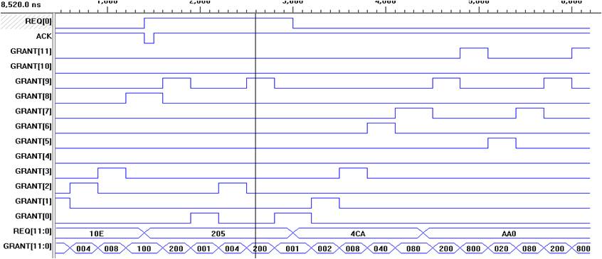Se obtuvo de la web el módulo VHDL para implementar un árbitro de prioridad rotatoria con espacios iguales de tiempo con cuatro peticionarios y cuatro concesiones, que lo adecuamos para seis peticionarios y las mismas seis concesiones [4].