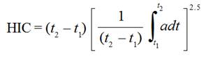 (8)Donde a es la aceleración lineal y t1, t2 es el intervalo de tiempo del impacto. Esto permitió la aparición de Head Injury Criterion (HIC). Este criterio se centra en la integración del intervalo de tiempo en la parte más perjudicial del impulso. Definiendo t1 y t2 como el momento en que iguales niveles de aceleración se producen en ambos lados en un instante de máxima aceleración. La aceleración lineal resultante en el centro de gravedad de la cabeza es medida en múltiplos de la aceleración de la gravedad. La expresión de HIC es la siguiente [17]: