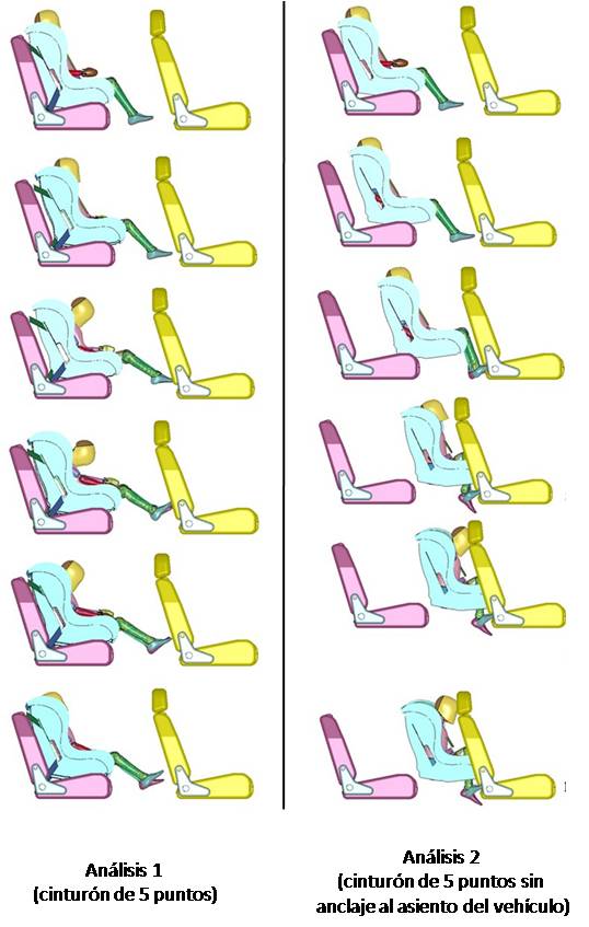Para el primer caso donde el infante sufre un impacto frontal al interior del vehículo. El análisis se lleva a cabo empleando el cinturón de 3 puntos, que sujete a la silla al vehículo como se indica en el manual de la propia silla para un infante de 6 años de edad. Mediante el pretensor de 5 puntos que incluye la silla. El mismo caso de estudio se lleva acabo pero en esta ocasión sin anclar la silla adecuadamente, para ello el infante será montado en la silla, pero la silla no se encontrará adecuadamente instalada sobre el asiento del vehículo.