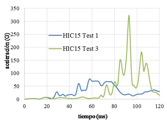 Los índices de lesión HIC de los últimos análisis se pueden observar en la Fig. 13. Para el análisis 3, se obtuvo un HIC = 3662. Para el análisis 4, el HIC obtenido es de 1708.