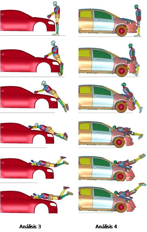 Para el caso de atropello, la simulación numérica se llevó a cabo en un intervalo de 150 ms. El resultado se muestra en la secuencia del análisis con vista lateral desde el instante t = 0 hasta t = 120 ms (véase Fig. 12).