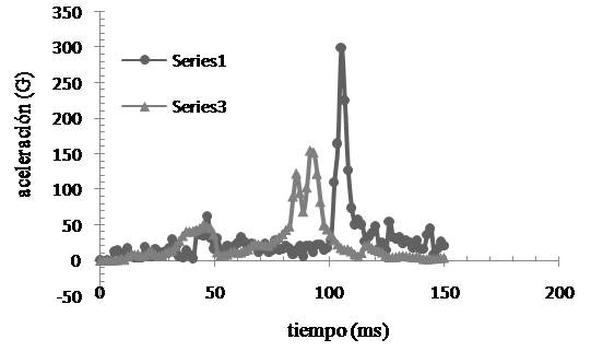 Para el primer caso donde el infante sufre un impacto contra un cuerpo rígido. La velocidad inicial para todas las partes es 13.34 m/s, la curvatura de desaceleración frenara los asientos del vehículo (véase Fig. 9).