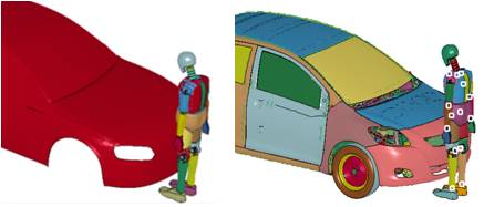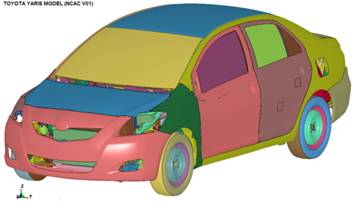 Uno de los modelos de automóvil utilizado fue desarrollado por National Crash Analysis Center (NCAC) y pertenece al modelo Yaris del segmento B producido por el fabricante japonés Toyota. Este modelo se comenzó a producir en el año 1999, existiendo 3 generaciones a través de los años. El modelo Yaris es uno de los vehículos más representativos en el parque vehicular de la Ciudad de México. El desarrollo de este modelo se llevó a cabo por el proceso de ingeniería inversa en la NCAC en el año 2012. Los modelos se han mantenido actualizados y se encuentra de manera libre desde su página oficial (véase Fig. 7) [20].