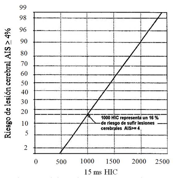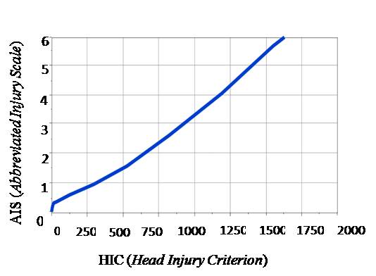 Actualmente se tiene una correlación entre el HIC ( Head Injury Criterion ) y AIS ( Abbreviated Injury Scale ). Basado en pruebas realizadas por ETH zürich, a partir de pruebas experimentales hechas con cadáveres. Estos experimentos dieron como resultado la gráfica que se muestra en la Fig. 4 y que se usará más adelante para determinar el daño sobre el peatón y el infante. Es importante mencionar que esta gráfica que fue desarrollado únicamente en impacto frontal [19].