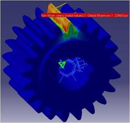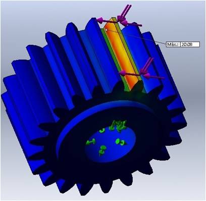 En todos los casos, el punto crítico se ubicó en la vecindad de la raíz del diente, tal como se muestra en la Fig. 3 y la Fig. 4 que corresponden al caso 1, identificado con SolidWorks y Catia respectivamente.