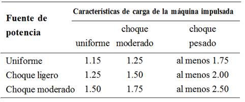 Para el cálculo y estimación de estos factores, existen métodos y fórmulas en la misma norma, a excepción del factor de sobrecarga Ko , en el que sólo se especifica que se debe considerar la probabilidad de variaciones que puedan causar cargas máximas mayores que Wt durante el funcionamiento. Sin embargo, no presenta valores específicos. Por tal motivo, diversos autores han establecido valores que juzgan adecuados con base en su experiencia para una aplicación particular [11], siendo una de las más reconocidas la propuesta de Shigley y Mischke [12], la cual se muestra en la Tabla 1.