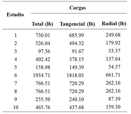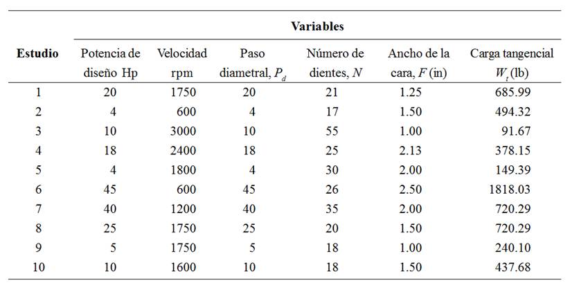 Para aplicar la ecuación de esfuerzo flexionante, en la Tabla 2 se presentan los datos de las variables principales para los diez casos de estudio analizados y sometidos a los tres niveles de carga mostrados en la Tabla 1, con una fuente de potencia uniforme.