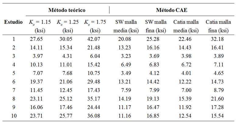 Los resultados obtenidos por el análisis teórico y por CAE de los diez casos considerados se muestran en la Tabla 5.