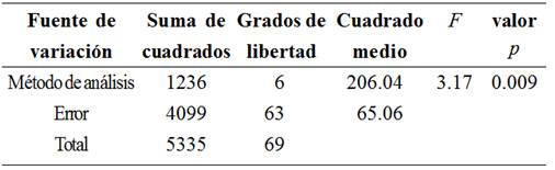 De los datos más relevantes de la Tabla 6, se observa que el cuadrado medio entre los resultados de los métodos de análisis es 206.04 que es varias veces mayor que el cuadrado medio del error (65.06), lo que indica que no es posible que las medias obtenidas sean iguales [18]. Para complementar esta afirmación, también se verifica que sí existen diferencias significativas ya que p <0.05 (0.009) lo que demuestra que al menos una media de los métodos de análisis es diferente.