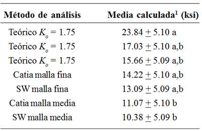 Con base en lo anterior, en la Tabla 7 se muestra el resultado de la prueba de Tukey, la cual, indica que la media obtenida por el análisis teórico aplicando un factor de sobrecarga Ko = 1.75 representado por la letra a presenta una diferencia significativa ( p <0.05) en sus resultados. Asimismo, los resultados obtenidos por el análisis CAE en ambos software al aplicar una malla media también presentan una diferencia significativa ( p <0.05), siendo identificados por la letra b .