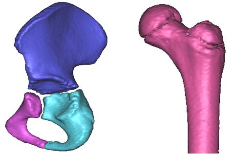 Por medio del software, se realizó la selección y edición de cada zona tridimensional (ilion, isquion y pubis; cabeza femoral), para su limpieza y obtención de la superficie acetabular. Los parámetros de limpieza fueron seleccionados en conjunto con el médico especialista. Los límites y la zona de medición fue dada por el contacto de la cabeza femoral en cada parte de la pelvis.
