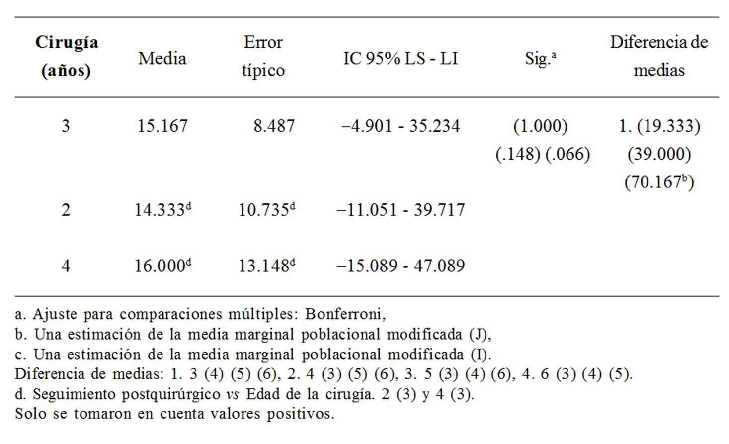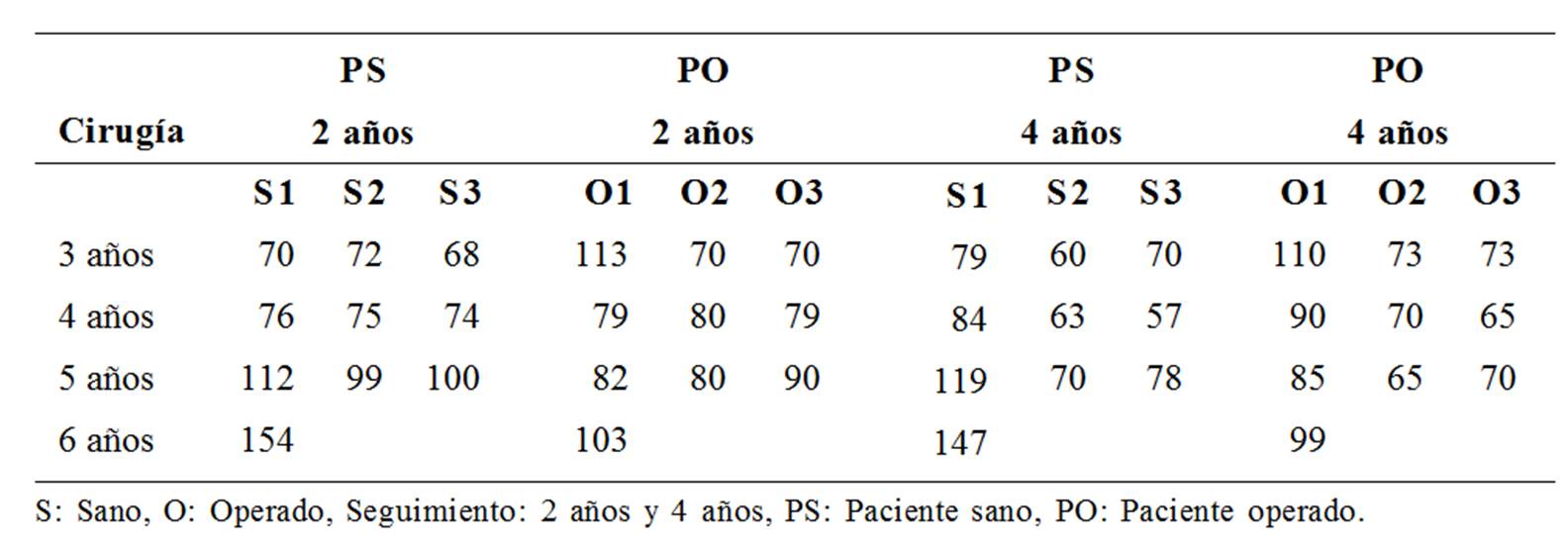 Se aplicó el modelo general lineal univariante para contrastar las medias de las diferencias entre lado operado vs sano (véase Tabla 1), a través de una ANOVA de dos factores ya que se tomó en cuenta simultáneamente el grupo de edad al momento de la cirugía y el grupo del tiempo de seguimiento a 2 y 4 años.