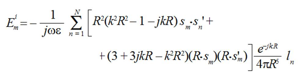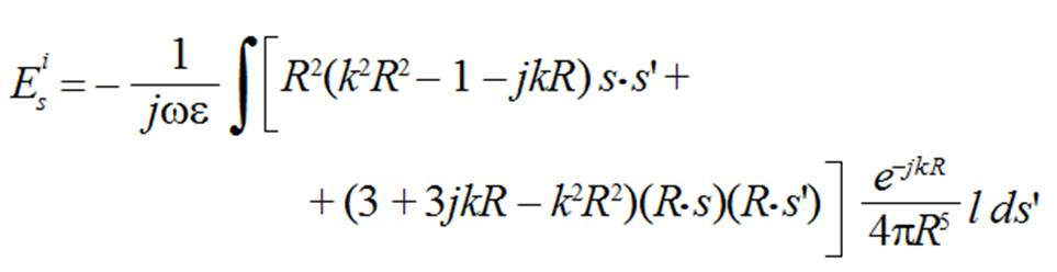 (2)La expresión (2) se llama ecuación generalizada de Pocklington y representa el campo tangencial en un punto s, producido por todos los elementos de corriente s' del conductor. En la integral la corriente es desconocida, por lo que no puede resolverse por métodos analíticos, pero sí mediante métodos iterativos. El cálculo debe hacerse para todos los puntos s sobre la superficie del conductor, lo que genera una matriz cuadrada que se resuelve usando el procedimiento conocido como Método de Momentos [6]. Para resolver la ecuación (2) se debe partir de la suposición de que el campo eléctrico tangencial sobre la antena es cero, excepto en el punto de alimentación, facilitando la solución. La propuesta es válida si se considera que la antena se construye de un conductor perfecto, con lo que se cumple con la condición de frontera de campo eléctrico tangencial cero sobre su superficie.