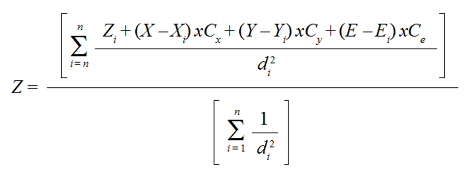 (1)Where: Z are the interpolated rain valued, Zi are the values of the meteorological stations; X,Y are the planar coordinates of the spot to be determined and E its height; Xi,Yi are the coordinates of the stations and Eiits height; di is the distance from the spot to the stations and Cx, Cyand Ce are the regression coefficients. By means of the linear regression, the Coefficients are determined.