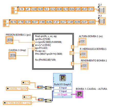Para hacer posible la presentación de cada una de estas curvas, se empieza por guardar los puntos tomados en pruebas y asignarlos a su matriz respectiva. En el nodo de fórmulas ingresan lo valores de Presión y Caudal devolviendo los valores de altura, potencia hidráulica y rendimiento.