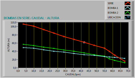 Como resultado se tendrá que, en un circuito en serie, el caudal (Qi), donde Q1 y Q2 corresponde al caudal de la bomba 1 y bomba 2, respectivamente, se mantiene y la altura total (Ht) del flujo es la suma de la capacidad de ambas bombas.