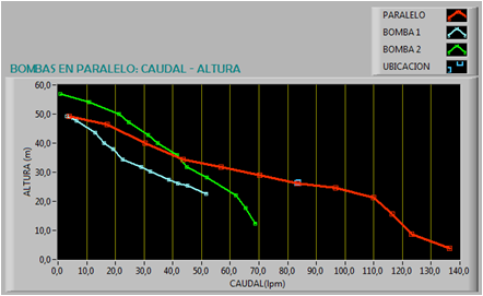 Dentro del software Labview se hizo la programación respectiva para poder presenciar en tiempo real el comportamiento de las bombas centrífugas. Se pide ingresar los parámetros de caudal, que se obtiene de forma visual a través de los rotámetros R1 Y R2, y el valor de presión que brinda los sensores TP1 y TP2 e interpretadas por la tarjeta Arduino, donde el software toma valor automáticamente una vez encendido el equipo. Para presentar la primera curva, caudal vs altura, hacemos uso de las ecuaciones 5, 6 y 9, donde se detalla a continuación un ejemplo para la obtención de un punto.