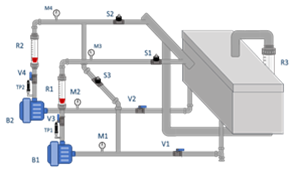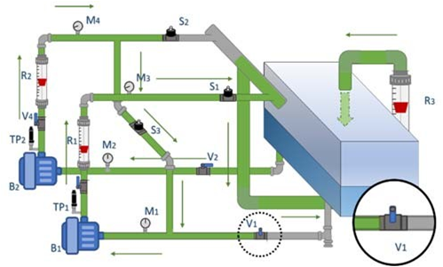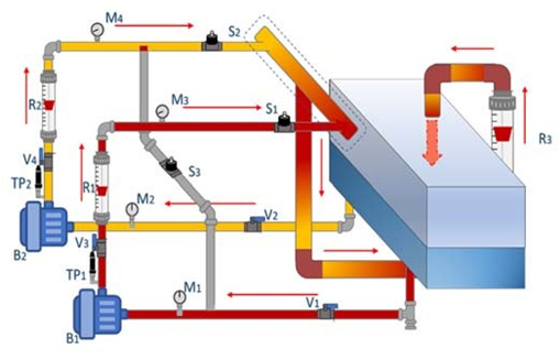 En la parte inferior del tanque, como se observa en la figura 2, al inicio del recorrido salen 2 tuberías de 1' donde hay dos válvulas manuales V1 y V2 encargadas de dar paso a la circulación del agua en dirección a las bombas centrífugas B1 y B2. Los manómetros M1 y M2 indican si existe presión negativa en ese punto. TP1 y TP2 son sensores de presión, que permiten adquirir datos en tiempo real, mostrar dichos datos en el sistema SCADA y así sacar las curvas características correspondientes del sistema. De los rotámetros R1 y R2 se toma datos manualmente sobre el caudal de agua a partir de ese tramo. Se puede observar presión también en M3 y M4; continuando con el recorrido se encuentran las válvulas solenoides S1, S2 y S3, normalmente cerradas, que se activarán desde un panel eléctrico o bien del sistema SCADA, al igual que las bombas centrífugas. La tubería de 1" donde se sitúa S3 es una retroalimentación que, al elegir un recorrido en serie, alimenta a B1 mediante B2, aplicando nuevos factores al sistema para obtener nuevas curvas características.