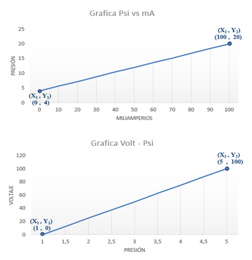 Los sensores de presión hidráulica colocados en puntos estratégicos del sistema funcionan a 24 volt dc y proporciona una corriente de salida de 4-10 mA, que, en relación a psi, significa que la presión va de 0 a 100 psi. La gráfica de la Fig. 5 nos muestra dicha relación haciendo uso de la ecuación de la recta dando 2 puntos.
