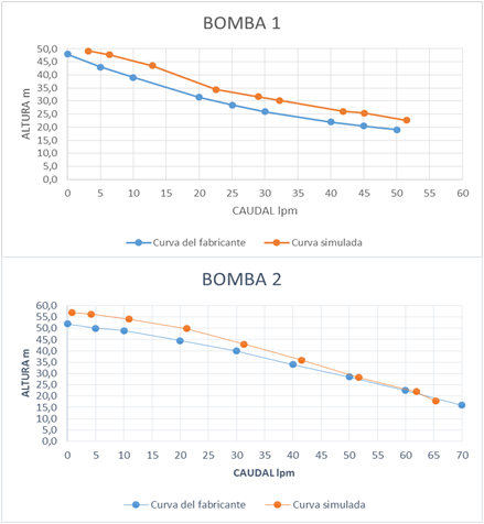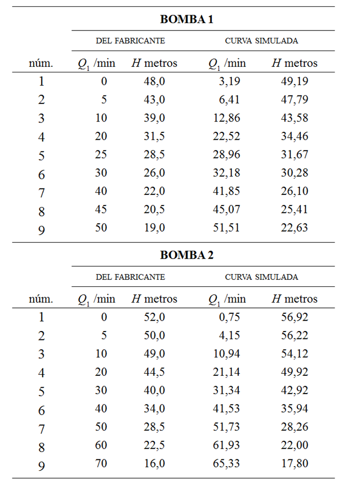 Siguiendo el mismo proceso, se obtiene 9 puntos estratégicos de forma práctica para Bomba 1 y Bomba 2, véase tabla 1, para crear una curva simulada y proceder a comparar con los puntos dados por el fabricante.