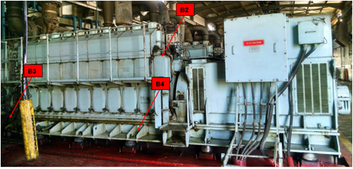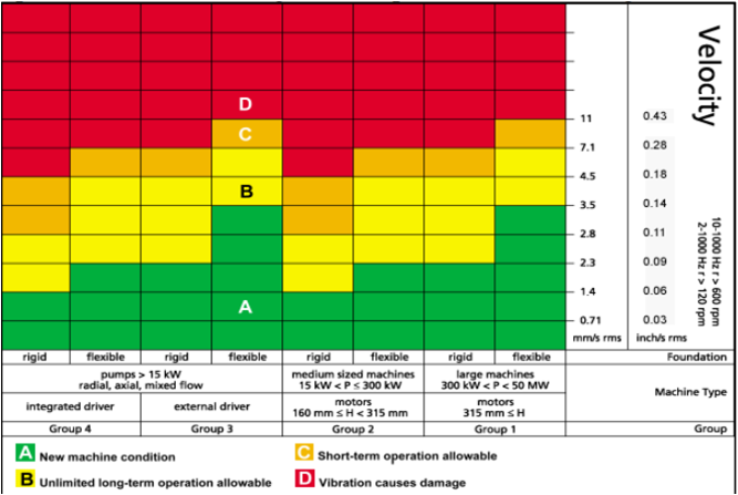 Teniendo en cuenta que el motor tiene una potencia de 2610 kW y se encuentra en estado estacionario se puede apreciar que el motor HYUNDAI HIMSEN 9H25/33 pertenece al grupo uno y como presenta un valor de 3,03 mm/s se encuentra en la zona amarilla por lo que puede funcionar en operación continua sin restricciones.