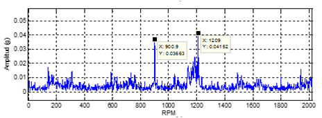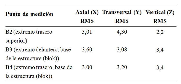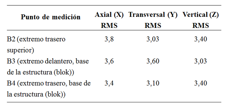 Al comparar las frecuencias naturales del sistema con el espectro de amplitudes (g) en el dominio de la frecuencia medidas en la base del motor durante el funcionamiento del mismo (véase Fig. 9) se observa que los picos de amplitud tienen lugar a frecuencias de 900,9 y 1 209 rpm, es decir, bastante alejadas de las frecuencias naturales y por tanto de las zonas de resonancia. Esto es una señal de funcionamiento adecuado del motor, desde el punto de vista dinámico.