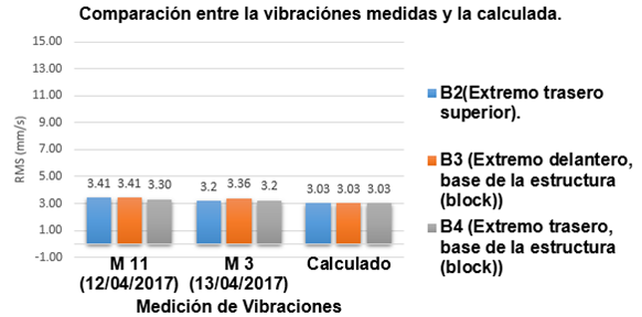 Si se realiza una comparación entre el valor de la amplitud máxima Xpicoy el valor eficaz o RMS medidos por el Vibrotip y los determinados con el empleo del MarPrime se puede obtener la Fig.10, donde se puede apreciar que si se promedia todas estas mediciones existe una diferencia de 0,28 mm/s de los valores reales con respecto al instrumento de medición por lo que el método empleado tiene gran veracidad. Además, ambas mediciones indican que el motor está en óptimas condiciones pues se recomiendan valores por debajo de 28 mm/s según el manual de instrucciones para el mantenimiento.