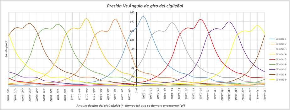 Con la ayuda de la Fig. 1 se puede elaborar un gráfico de presión contra ángulo de giro del cigüeñal y tiempo que se demora en recorrer dicho ángulo; desfasado 40° cada cilindro (véase Fig. 2).