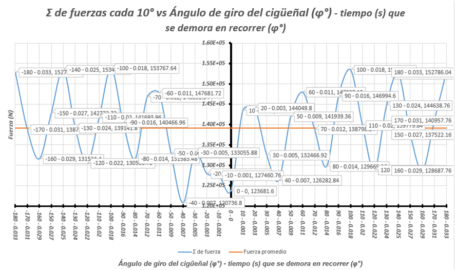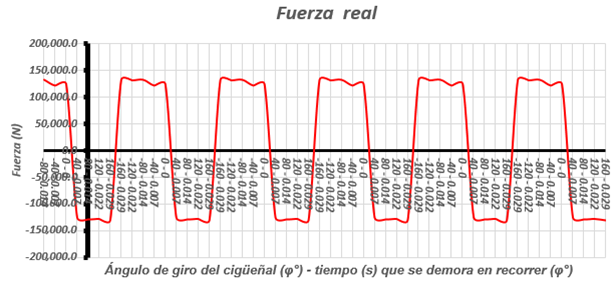 Si se realiza una sumatoria de las fuerzas en cada diez grados se puede obtener un gráfico (véase Fig. 4) el cual es de gran importancia para poder determinar los distintos parámetros que definen los valores de la fuerza excitadora interna del motor.