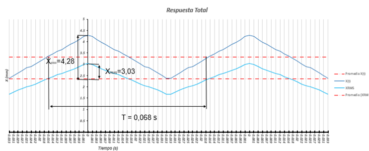 Por lo tanto el valor amplitud máxima con relación a la posición de equilibrio (Xpico) es de 4,28 mm y el valor eficaz o RMS (mm) de la amplitud es 3,03 mm/s. El periodo de esta vibración es de 0,068 por lo que presenta una frecuencia de 14,71 Hz que es igual a 92,40 rad/s o 882,36 rpm.