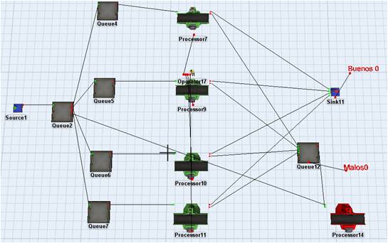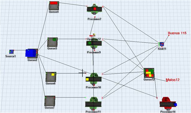 - En caso de no ser enviados al Sink por cumplimiento de las pruebas son enviados a una mesa de retrabajo Processor 14 para su análisis y al no cumplir con las especificaciones son enviadas al Queue 2 para empezar nuevamente el proceso de pruebas (véase Fig. 1).