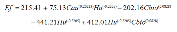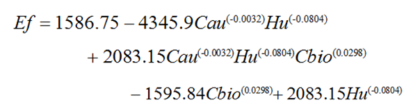 Siguiendo los diferentes métodos de selección de modelos expuesta anteriormente y se hallaron los modelos que describen el desempeño de los indicadores. Como paso previo a su elaboración fueron halladas mediante ecuaciones logarítmicas auxiliares las potencias de mejor ajuste y, ayudados por los distintos métodos de elaboración de modelos expuestas en el apartado 3, fueron excluidos uno a uno los términos no significativos. Como resultado fueron encontrados los siguientes modelos para la estimación de los indicadores de desempeño de la operación del proceso.