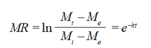 (3)En la ecuación 3, Mees el valor del contenido de humedad en equilibrio, la cual se considera es el contenido de humedad al finalizar el periodo de secado a velocidad constante. Para obtener el valor de la constante de secado, se pueden trazar los datos del logaritmo natural de la relación de humedad con respecto al tiempo, obteniéndose una línea recta cuya pendiente hay que calcular.
