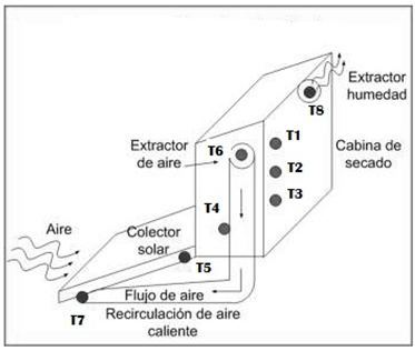 En el secador solar se instalaron 8 termopares tipo K para medir las temperaturas tanto en diversos puntos del secador, así como la del ambiente. De la misma forma se mantuvo un registro de la irradiación solar, humedad ambiente, y peso de las muestras. En el diagrama de la Fig. 3, se muestran los puntos en donde se instalaron los termopares para analizar el comportamiento del proceso.