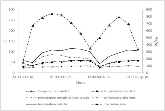 En la Fig. 4, se observa el comportamiento de las temperaturas en los diferentes puntos del secador, comparado con la variación de la irradiación solar registrada en los días de prueba. En este caso se reportan las pruebas realizadas durante el mes de marzo de 2018.