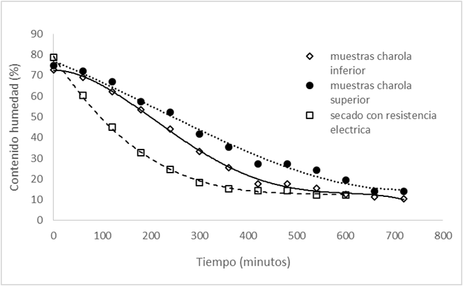 En la Fig. 5, se muestra el comportamiento del contenido de humedad en las muestras. Con el uso del secador solar, se alcanzaron contenidos de humedad final tanto en la charola superior como en la inferior de 12%, mientras que, en una prueba realizada en laboratorio con un horno de secado, en donde se sometieron algunas muestras a un proceso de secado a una temperatura constante de 55°C, se pudo lograr un contenido de humedad final de 8%.