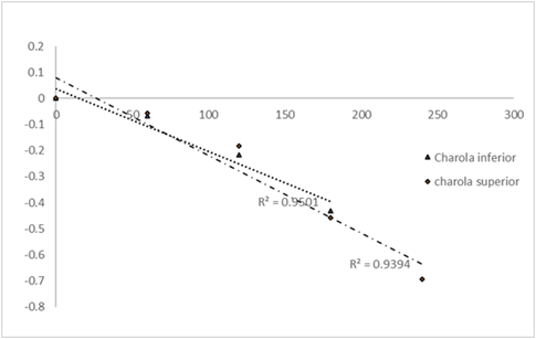 En la Fig. 6, se muestran los resultados obtenidos de la obtención del logaritmo natural de la relación de humedad, y su aproximación a una línea recta, cuya pendiente puede ser calculada, para que, a partir de dicho dato, obtener los valores de la difusividad específica.