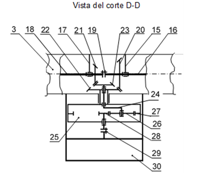 Los engranajes están diseñados de modo que el engranaje de las ruedas 21 con 23 tenga dimensiones menores que el de la 20 con la 22, y el eje geométrico de la rueda 23 coincida con el eje de la rueda 22. Además, la flecha en la rueda 22 es hueca, de modo que la flecha de la rueda 23 puede instalarse en esta cavidad. La flecha de la rueda 23 se conecta con el brazo 24 del multiplicador, y la flecha de la rueda 22 con la carcasa 25 del multiplicador. El satélite 26 está montado en el brazo 24 y a la vez está engranado con el engrane sol 28 y con la corona 27. La corona 27 se fija con la carcasa 25, formado de tal manera un solo eslabón. La flecha del engrane sol 28 mediante el acoplamiento 29 se conecta con la flecha del rotor del generador eléctrico 30.