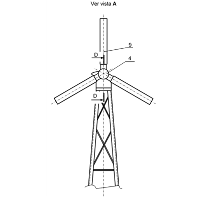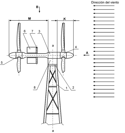 El aerogenerador está compuesto de la torre 1, encima de la cual se instala la base 2. En la base 2, se instala la góndola 3 con la capacidad de girar libremente alrededor de un eje que coincide con el eje a-a de la torre y de modo que el centro de gravedad esté en el eje de rotación de la góndola. En los extremos de la góndola 3 se instalan dos turbinas: una de barlovento 4 y otra de sotavento 5. Las turbinas 4 y 5 se instalan de manera que las palas de la turbina de sotavento 5 y de la de barlovento 4 tengan la misma proyección sobre el plano perpendicular al eje de rotación, con lo que desde la vista frontal se observa como si fuera una sola turbina. Las turbinas 4 y 5 tienen el mismo diseño, el mismo sentido de rotación y la misma velocidad angular. Las turbinas de barlovento 4 y de sotavento 5 se instalan en los extremos de las flechas, las cuales se colocan dentro de la góndola 3 y mediante el multiplicador de velocidad 8 [6] transmiten un movimiento giratorio a la flecha del generador eléctrico. El aerogenerador está equipado con un sistema para cambiar automáticamente la orientación de la góndola con respecto a la dirección del viento [1].