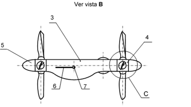 Para el modelo del aerogenerador que se presenta, no se requiere el uso de frenos, ya que la reducción de la velocidad de rotación de las turbinas se logra mediante el cambio de la posición angular de la góndola con respecto a la dirección del viento. El sistema de la variación automática de la posición de la góndola con respecto a la dirección del viento consta de una o dos pantallas 6 unidas a la varilla 7, la cual pasa a través de la góndola 3 en el lado de sotavento M, lo más cerca posible a la turbina de sotavento 5 (véase Fig. 1 y Fig. 3). La varilla 7 cinemáticamente se conecta a un mecanismo de giro ubicado dentro de la góndola 3 (no se muestra en las figuras). Como mecanismo de rotación de las pantallas, se puede usar cualquier mecanismo de palanca o de engranes capaces de rotar la varilla 7 alrededor de su eje y, por lo tanto, cambiar la dirección del plano de las pantallas 6. Una de estas soluciones se presenta en [5].