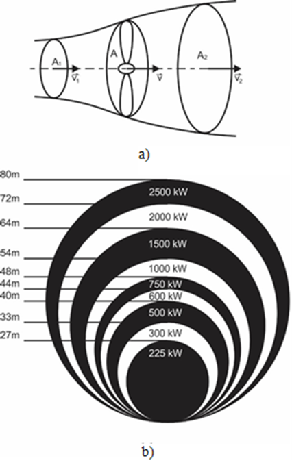 Era muy importante conocer el tamaño y la configuración de las palas. Se conoce la dependencia de la potencia del aerogenerador del diámetro de las turbinas, la cual se basa en el modelo de Betz presentado en la Fig. 4a. Se considera que la potencia de una turbina depende solamente del área de barrido de las palas, esta dependencia se ilustra en la Fig. 4b.