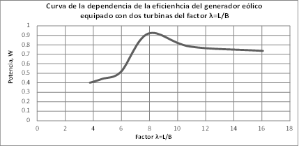 En la Fig. 5 se muestran los resultados de las pruebas. Dichos resultados mostraron que las palas con una relación de la longitud L a la anchura B igual a = L/B = 8 desarrollan una mayor potencia, por consiguiente tienen mayor eficiencia en el uso de la energía cinética del viento.