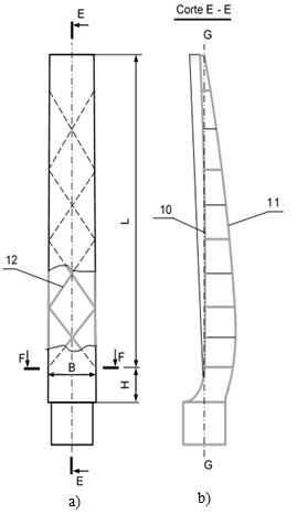 Con base en las pruebas realizadas, se desarrolló el diseño de la pala [7], cuyo esquema se muestra en la Fig. 6. Las palas se hacen en dos partes: una parte delantera 10 y la otra trasera 11. Dentro de las palas se colocan las costillas 12. Las costillas tienen forma cruzada y se unen a la parte delantera 10. La parte delantera 10 de las palas se hace recta en la dirección longitudinal que coincide con el eje G-G, o para compensar la deformación elástica de las palas causada por la fuerza del flujo de aire, ligeramente cóncava, como se muestra en la Fig. 6b. Las palas se hacen helicoidales, para esto se tuercen de modo que la línea de intersección de la superficie frontal de la parte 10 con el plano perpendicular al eje G-G de la pala, tenga el mismo paso en todas las secciones. De este modo se obtiene una pala con la superficie frontal de la parte 10 con forma de helicoide axial recto.