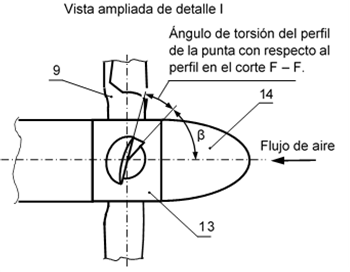 La distancia H de la pala, que determina la posición de la sección F-F desde la superficie del cubo 13, se elige constructivamente y depende del diseño de las turbinas 4 y 5. Para reducir la resistencia frontal al flujo de aire, la parte delantera de los cubos 13 está cubierta por los carenados 14.