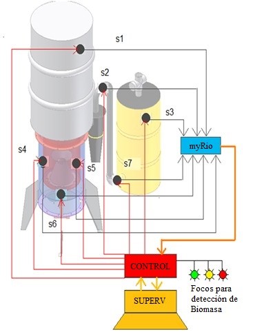 El proceso de control del gasificador empieza con la medición en su gran mayoría de las termocuplas cuyas señales son enviadas a una tarjeta de adquisición de datos myRIO quien al mismo tiempo envía la señal transformada a un computador, donde se puede verificar al mismo tiempo la entrada de aire por medio de la apertura o cierre en forma manual de una válvula de admisión de aire conectada a un sistema Venturi, el mismo que absorberá el aire en el reactor y al mismo tiempo el gas producido para obtener el efecto de gasificación, ya que este proceso se produce por una baja cantidad de oxígeno.